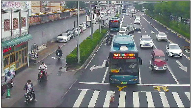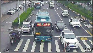 记者从监控录像看到,7月12日13点03分左右,张滨驾驶车辆驶离济齐路交校路站点,前方路口信号灯为绿灯,张滨仔细观察路口周围情况后,准备驶过。