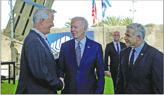 拜登当地时间13日抵达以色列。他在欢迎仪式上强调,将力促以色列在中东地区的融合,并确保全力阻止伊朗核计划。拜登与以色列总理拉皮德等一起参观了以色列的防空系统。他在接受以色列电视台采访时表示,美国不排除将使用武力“作为针对伊朗的最后手段”。拉皮德说,两国领导人将讨论国家安全问题,包括“建立强大的全球联盟以阻止伊朗核计划的必要性”。