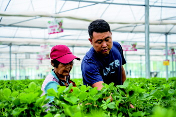 产业园一开始种的是蝴蝶兰、红掌等花卉,对温度要求较高,电费等成本支出大。郭振莲认真研究改种草莓。“在棚内种植草莓,开始很多专家并不看好,后来我们种出来之后,效果很好,得到了很多专家的认可。”郭振莲和国内多名种植业专家建立了联系,可随时获得线上指导。