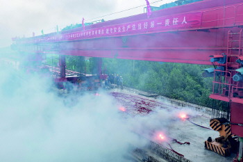 7月12日下午4时40分,莱荣高铁乳山寨玉皇山隧道前,最后一榀箱梁稳稳地落在桥墩上,标志着中铁四局莱荣铁路二标威海段箱梁架设任务全面完工,成为全线首个完成箱梁架设任务的梁场。中铁四局承建的乳山西制梁场位于乳山口镇西南赵家村,承担354孔箱梁的预制和架设任务,去年8月16日首榀箱梁架设完成。