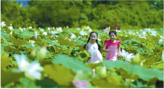 两名小游客在欣赏荷景。 视频截图