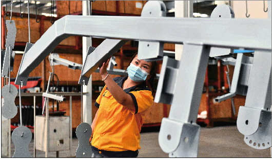 为统筹疫情防控和经济社会发展,山东省宁津县出台一系列助企业、稳行业、促消费政策,用“真金白银”帮企业“补气血”“通经络”。图为山东罗赛罗德健康产业有限公司工作人员在加工健身器材。 新华社发