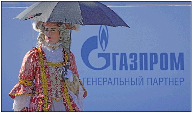 5月27日,一名身着古装的演员从俄罗斯天然气工业股份公司的标识旁走过。 新华/美联