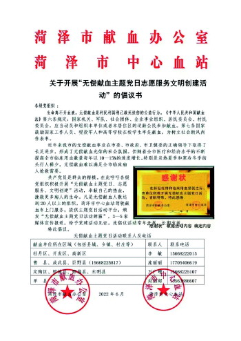 共产党员是群众的楷模。在此呼吁各级党组织积极开展“无偿献血主题党日、志愿服务、文明创建”活动,奉献自己的热血,挽救更多病人的生命。凡是无偿献血人数达到20人以上的组织,菏泽市中心血站驾驶献血车上门服务,提供主题党日活动平台,颁“无偿献血主题党日活动牌匾”,此倡议活动常年开展,长期有效。