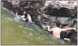 水下暗流涌动,营救十分困难。刘春晓1.8米的大个子,伸脚也探不到水底,在距离小孩一米远的地方,二人又被水流冲得往后退去。万幸孩子被水冲到崖边后,用力抓住了石壁上的缝隙,勉强让自己不被冲走。