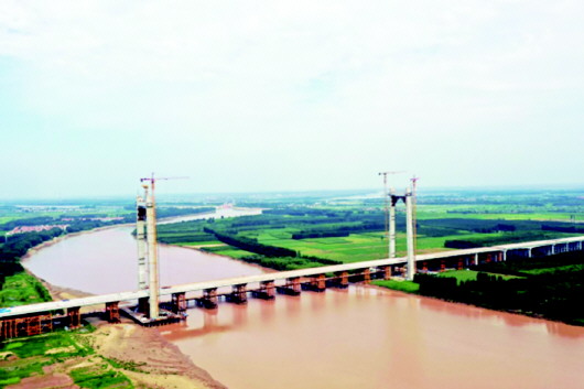 因黄河下游不具备通航条件,大桥跨黄河段梁体架设无法按照一般跨河桥梁施工模式,开展水上运输及吊装,因此,项目采用不受桥下地形和水流干扰的顶推法,并且创新应用全断面顶推施工方法,较传统顶推法相比,可缩短工期达半年以上。