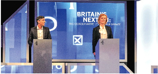7月15日,苏纳克(左)与特拉斯在保守党党首竞选电视辩论活动现场。 IC photo