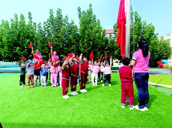 讲红色故事、唱红色歌曲……从周一的升旗仪式,到一日活动中的各种教育契机,红色文化无处不在,爱党爱祖国的情怀在孩子的内心生根发芽……