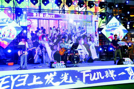 夏日和狂欢,只差一场音乐节的距离,晚上六点半,“EYE上发光 Fun肆一夏”夏日露天音乐节正式开幕,齐鲁晚报、天猫等多个平台进行同步直播。日落之际,广大朋友齐聚悦立方中心广场,伴着微风、听着音乐,惬意满满,2支本土乐队脍炙人口的金曲一首接着一首,满足每一位在场朋友的耳朵,引发集体合唱,现场掌声阵阵!同时,活动在线观看量近60万人次。