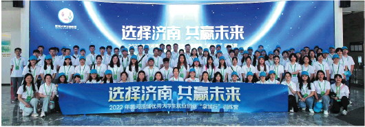 “选择济南 共赢未来”2022年黄河流域优秀大学生就业创业“泉城行”训练营活动由中共济南市委、济南市人民政府指导,济南市人力资源和社会保障局主办。为让优秀青年学子能全方位感受这座城市的蓬勃生机和现代魅力,济南市人社局从市情和独特优势出发,立足大学生就业创业需求,对本次“泉城行”训练营活动七天六晚的行程进行了精心细致的安排设计。百名优秀大学生齐聚黄河之畔、古韵济南,围绕济南“东强西兴北起中优南美”的规划,走进大明湖、省会大剧院,一起感受泉城的山水人文,了解泉城的人才政策和优势产业;走进中国重汽、浪潮集团、齐鲁制药等企业观摩,与50多家企业HR面对面交流,了解济南市重点企业和产业园区发展状况及人才需求;走进济南的新旧动能转换起步区,了解济南的强省会战略;走进三涧溪村,感受新农村建设;参与就业创业指导课,现场模拟创业实训等活动……营员们与同袍交流,向前贤求教,在济南寻觅未来的无限可能。