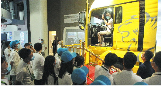 学子们在重汽博物馆试驾高端重卡。 记者 王鑫 摄