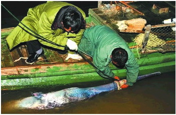 2002年12月11日夜,人们救治一尾受伤白鲟。