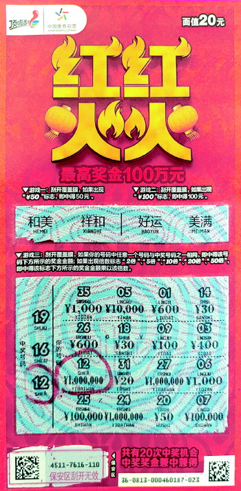 体彩顶呱刮新票“红红火火”正在我省火热销售中,该票单张面值20元,共有20次中奖机会,最高奖金达100万元。“红红火火”采用找奖金符号和数字匹配相结合的方式,简单易上手,赶紧去附近的体彩投注站里邂逅一份惊喜和幸运吧! (刘凯)