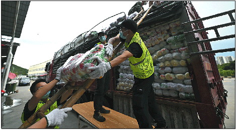 8月8日,在三亚一农副产品批发市场,工作人员在搬运从岛外运来的蔬菜。  新华社发