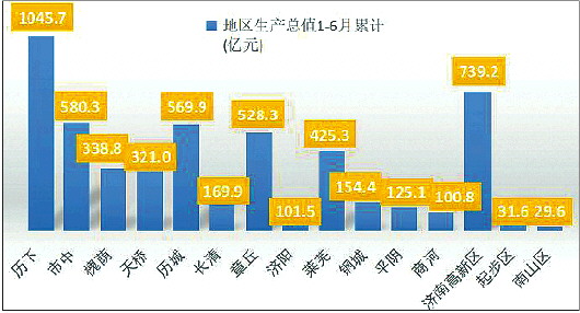 其中,历下区1045.7亿元、高新区739.2亿元、历城区569.9亿元、市中区580.3亿元、章丘区528.3亿元,分获前五名。五个区合计贡献了3463.4亿元,占1—6月全市经济总量的63.18%,继续稳固了全市的基本盘。