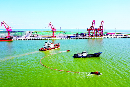 在商渔船碰撞溢油应急处置演练中,模拟一艘商船和一艘渔船发生碰撞后,渔船受损较大,导致燃油泄漏。开发区立即启动海上溢油事件应急处置预案,将事故报送至海上溢油事件应急处置搜救中心,胜利503溢油回收船和2艘685工作艇迅速出动,充分发挥专业优势,完成海上溢油处置工作。