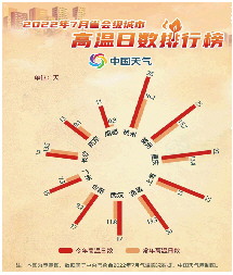 国家气候中心副主任肖潺介绍,7月份全国平均气温23.2℃,较常年同期偏高1℃,为1961年以来历史同期第二高;全国平均高温日数(日最高气温≥35℃)5.6天,较常年同期偏多2天,为1961年以来历史同期第2多(仅次于2017年)。全国有245个国家气象站日最高气温突破7月历史极值。