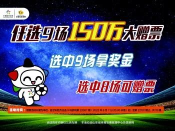 喜爱传统足彩的小伙伴们,好消息来了,足彩胜负任选9场150万赠票活动来啦!选中9场拿奖金,选中8场可赠票,助力大家向大奖“发起冲击”!