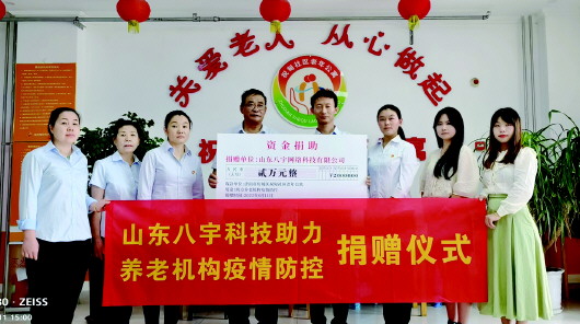 山东八宇科技有限公司,是一家专做智慧养老产品的民营企业,也是与养老院签约的共建单位,在疫情防控的关键时刻,赠送了大量的防疫物资,并提供了部分资金捐助,为进一步探讨院企合作、院企共建,为养老产业的可持续性发展起到了积极的推动作用。