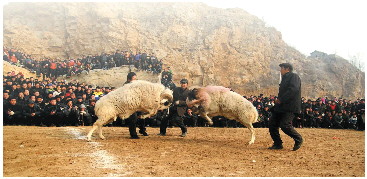 鲁西南的斗羊习俗以梁山县最为著名,斗羊是梁山地区由来已久的民间习俗,也是当地乡村集市、古庙会、春节及喜庆之日的重要娱乐项目。