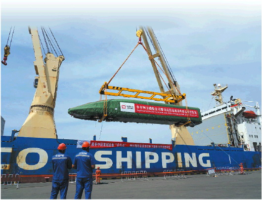 图为雅万高铁高速动车组在青岛港装船。 记者 赵波 通讯员 邓旺强 摄影报道