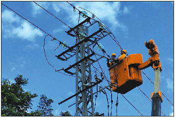 南方电网广西南宁供电局工人顶着酷暑进行高空带电作业。新华社