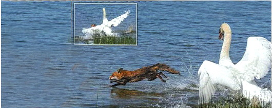 天鹅大发雷霆,把试图偷袭宝宝的狐狸撵得慌不择路往湖里跑。