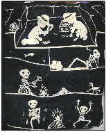 我问安顿我们住宿的李萌同学这个标志有什么寓意。巧的是“进庙遇到了真神”,这个标志的设计就出自她手。“这个标志也没有很深的含义,这个小骷髅是基地考古队设计的一个吉祥物形象,坐在手铲上比个‘V',是契合快乐考古的理念。”说实话,我挺佩服这位零零后小姑娘,她把考古人司空见惯的人骨做成了这么萌的卡通形象,坐上像要起锚待航的手铲,手铲对于考古人来说,就如同是战士手中的枪。她分明是要表达通过锻炼手铲功夫,开启田野考古发掘的大门,在快乐中徜徉于历史的长河里。工具包的另一面就更有意思了,一层层的地层线中分别表示不同的情景,他们的吉祥物扮演着不同的角色。