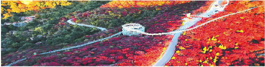 “待上述三条隧道全部打通后,红叶柿岩景区目前覆盖的姚家峪、和尚房、马公祠、樵岭前、白洋河、岭西这六个村,将彻底实现互通,村民出行不用再翻山越岭了。”开车驶过隧道,沿着红叶柿岩十八弯山路行驶。山脉绵延,到了山顶,房利军指着两侧的风景说,“这半山是红叶,另外半山是梯田。这是不能复制的美景,只有博山才有。”