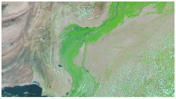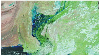 据美国有线电视新闻网报道,美国国家航空航天局MODIS卫星感应器8月28日拍摄的图像显示,信德省大片地区浸在水中。照片中央有一片深蓝色区域,显示印度河倒灌淹没的区域宽约100公里,原本是农田的地方变成一个巨大的“内陆湖”。