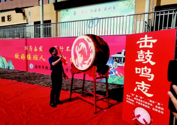 在入学仪式上,新生在班级树上摁多彩手印、校长击鼓明志、班级授权仪式、学生宣誓等,给足孩子们仪式感。