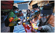 工作人员在磨西镇发放热水和方便面。 新华社发