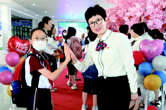 本报讯(通讯员) 9月1日,望海园中学举行新学期开学典礼。当日,学生们踏上红毯进入校园,穿过智慧门,在樱花树下摘取塞满老师祝福的红包,与老师们热情击掌,参加隆重的开学典礼仪式。丰富精彩的开学第一课上,在优秀教师的演讲中,学生们更加感受到了“生在红旗下,长在春风里”的幸福感。