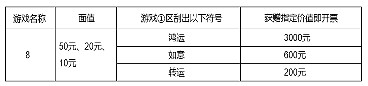 为了给惊喜加码,属于山东购彩者的专属福利活动同时开启,2022年9月2日至10月10日,购彩者在我省体彩销售网点购买任意面值“8”主题系列即开票,如在票面“游戏①”区内刮出指定符号,通过销售网点终端“快速促销兑奖”模块扫描兑换成功后,即可获得指定价值的即开票奖励。具体内容如下(见下表):