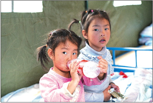 9月6日,两名儿童在四川甘孜州泸定县磨西镇海螺沟广场受灾群众临时安置点休息。 新华社发