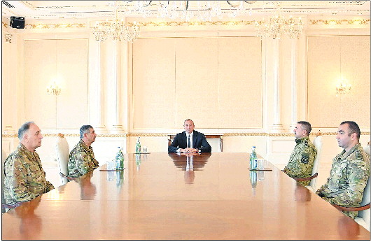 当地时间9月13日,阿塞拜疆总统阿利耶夫与军方人员会晤。 IC photo
