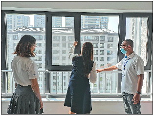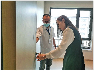 业主在专业人员的陪同下检查房屋内的门窗等设施。
