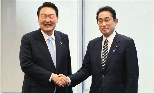 21日,韩国总统尹锡悦(左)与日本首相岸田文雄在纽约见面合影。