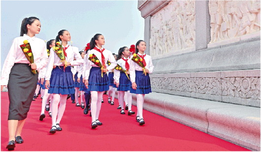 天地英雄气,千秋尚凛然。烈士纪念日向人民英雄敬献花篮仪式9月30日上午在北京天安门广场隆重举行。图为少年儿童敬献鲜花并瞻仰纪念碑。 新华社发