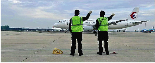 “飞机拜拜员”正在工作。 东航安徽分公司供图