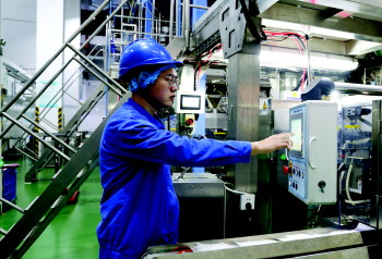 乖宝智能工厂生产车间内,工作人员正在对技术设备进行调试和监测。