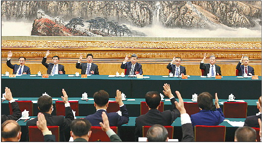 会议首先在大会秘书长王沪宁主持下,以举手表决方式通过了由习近平同志等46人组成的主席团常务委员会名单。