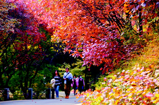 “南山有红叶,霜重色愈浓”,郊野的秋景同样精彩。当前,济南红叶谷景区呈现出一幅五彩斑斓的绚丽画卷。万叶塔、琵琶桥、湖心亭错落有致,与缤纷的红叶相辅相成,倒映在绚秋湖中,“天气晚来秋”的景色美不胜收,让人如痴如醉。“黄栌是红叶谷独有的观赏树种,就是这种圆形叶片的乔木,让景区内万山红遍、层林尽染。”红叶谷工作人员介绍说,景区内还有松柏、红枫、紫藤等400余种、百万余株树木。