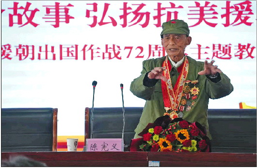 今年10月25日是中国人民志愿军抗美援朝出国作战72周年纪念日。24日,鱼台县抗美援朝老兵陈宪义再次为当地学子讲起上甘岭战役的战斗故事。这位年已91岁高龄的老兵,身着绿色军装,胸前挂满军功章,笔直地站在讲台上。他洪亮的声音响彻整个报告厅,将人们的思绪带回到那个烽火连天的岁月。