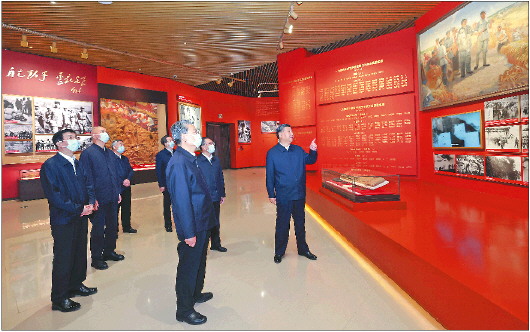 10月27日,中共中央总书记、国家主席、中央军委主席习近平带领中共中央政治局常委李强、赵乐际、王沪宁、蔡奇、丁薛祥、李希,瞻仰延安革命纪念地。这是习近平等在延安革命纪念馆,参观《伟大历程——中共中央在延安十三年历史陈列》。 新华社发