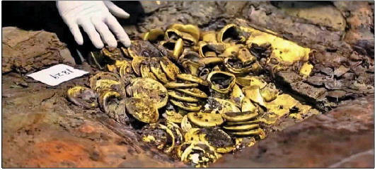 然而真正的重头戏才刚刚开始,在主棺室的一个角落里,发现了不少漆器盒子,其中一盒装满了汉武帝时代用于赏赐亲信和功臣的皇家特制纪念币马蹄金和罕见的麟趾金,另外两盒是码放整齐的金饼,共187枚。