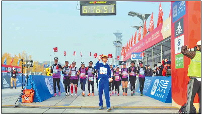 领跑有时间限制,每5公里处都设有关门时间节点,我们要根据《竞赛规则》规定的自然时间跑过这些时间节点。我们到玲珑塔下6号门的时候是6小时14分钟,在我们身后的参赛选手已经寥寥无几了。收尾组需在6小时15分钟完赛,距终点不足100米,我们所有人都在给老人加油,给他鼓劲。