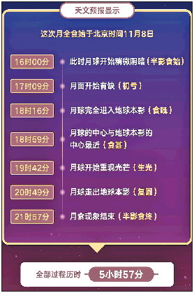 天文预报显示,这次月全食始于北京时间11月8日16时00分,全部过程历时5小时57分,其中本影食(月球进入地球本影,被全部或部分遮掩的现象)历时3小时40分。(详见右图)