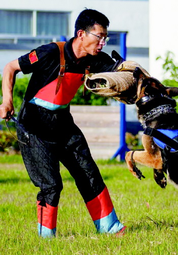 孙安教狗咬靶以练习狗捕捉犯罪人员时的咬准度。