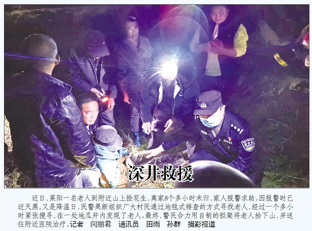 近日,莱阳一名老人到附近山上捡花生,离家8个多小时未归,家人报警求助。因报警时已近天黑,又是降温日,民警果断组织广大村民通过地毯式排查的方式寻找老人,经过一个多小时紧张搜寻,在一处地瓜井内发现了老人。最终,警民合力用自制的担架将老人抬下山,并送往附近医院治疗。记者 闫丽君 通讯员 田雨 孙群 摄影报道
